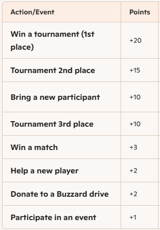 Below is the current point system used for all Buzzard-hosted Magic events. Totals reset each season, but legends? Legends live on.